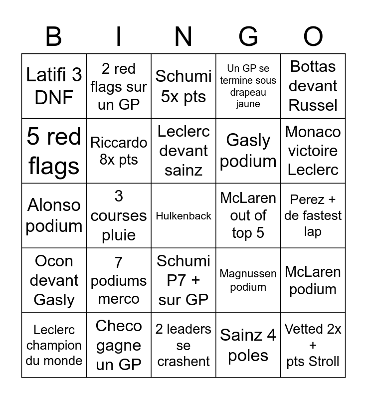 This bingo card has a free space and 24 words: 7 podiums merco, Checo gagne un GP, Leclerc devant sainz, Leclerc champion du monde, Bottas devant Russel, Latifi 3 DNF, 5 red flags, 2 red flags sur un GP, McLaren out of top 5, Schumi P7 + sur GP, Gasly podium, Alonso podium, Magnussen podium, McLaren podium, Riccardo 8x pts, Sainz 4 poles, Perez + de fastest lap, Schumi 5x pts, Monaco victoire Leclerc, 3 courses pluie, Vetted 2x + pts Stroll, Ocon devant Gasly, Un GP se termine sous drapeau jaune and 2 leaders se crashent.