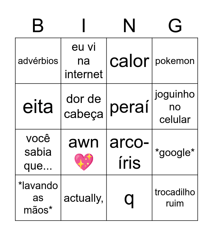 This bingo card has 16 words: actually,, *google*, calor, advérbios, você sabia que..., eu vi na internet, arco-íris, q, eita, dor de cabeça, *lavando as mãos*, pokemon, awn 💖, joguinho no celular, peraí and trocadilho ruim.