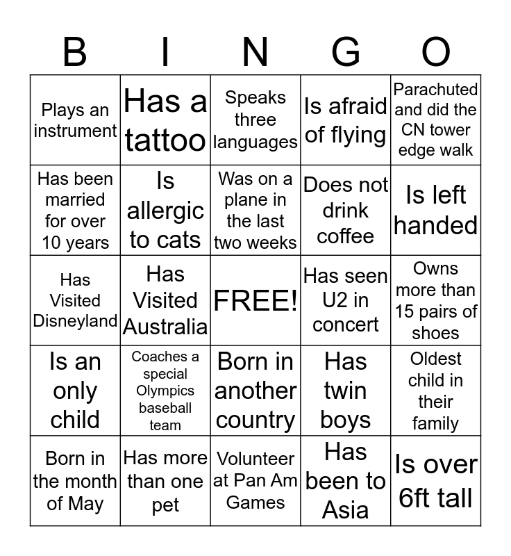 This bingo card has a free space and 24 words: Coaches a special Olympics baseball team, Has more than one pet, Was on a plane in the last two weeks, Born in the month of May, Parachuted and did the CN tower edge walk, Plays an instrument, Has been married for over 10 years, Has a tattoo, Has seen U2 in concert, Born in another country, Does not drink coffee, Has Visited Disneyland, Has twin boys, Oldest child in their family, Is allergic to cats, Has been to Asia, Owns more than 15 pairs of shoes, Speaks three languages, Is left handed, Has Visited Australia, Is over 6ft tall, Is an only child, Is afraid of flying and Volunteer at Pan Am Games.