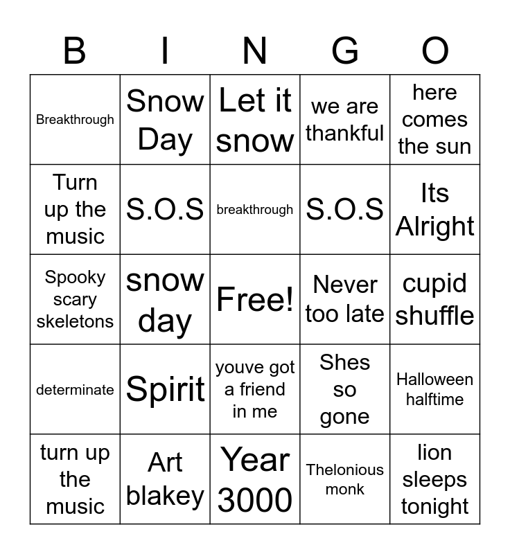 This bingo card has a free space and 39 words: you're my best friend, year 3000, spirit, S.O.S, turn up the music, youve got a friend in me, breakthrough, never too late, here comes the sun, determinate, snow day, we are thankful, lion sleeps tonight, cupid shuffle, Never too late, Spirit, Cupid shuffle, Breakthrough, determinate, Shes so gone, Turn up the music, Year 3000, S.O.S, Its Alright, Favorite Things, Lion sleeps tonight, Youre my best friend, Youve got a friend in me, It dont mean a thing, Snow Day, We are thankful, Sleigh ride, Let it snow, Art blakey, Thelonious monk, Peppermint patty, Halloween halftime, Spooky scary skeletons and Turkey in the hay.