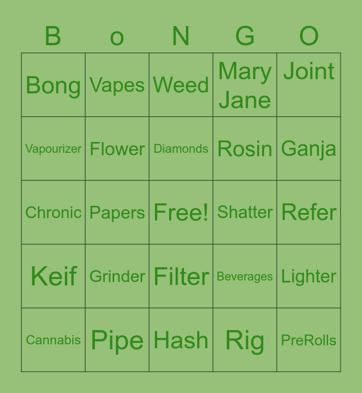 This bingo card has a free space and 29 words: Cannabis, Edibles, Papers, Wax, Bong, Weed, Flower, Grinder, Shatter, Pipe, Refer, PreRolls, Hash, Rig, Ganja, Topicals, Filter, Keif, Joint, Chronic, Beverages, Rolling Tray, Rosin, Vapourizer, Mary Jane, Vapes, Lighter, Diamonds and Blunt.
