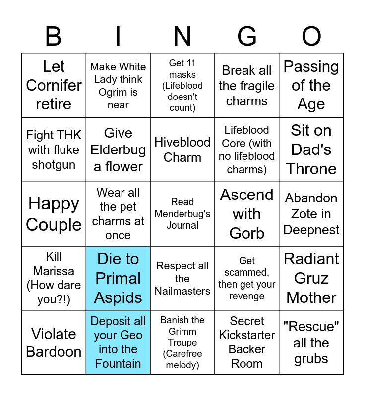 This bingo card has a free space and 24 words: Die to Primal Aspids, Deposit all your Geo into the Fountain, Hiveblood Charm, Violate Bardoon, Passing of the Age, Let Cornifer retire, Fight THK with fluke shotgun, Make White Lady think Ogrim is near, Ascend with Gorb, Respect all the Nailmasters, Lifeblood Core (with no lifeblood charms), Happy Couple, Get scammed, then get your revenge, Radiant Gruz Mother, Give Elderbug a flower, Secret Kickstarter Backer Room, Abandon Zote in Deepnest, Get 11 masks (Lifeblood doesn't count), Sit on Dad's Throne, Wear all the pet charms at once, "Rescue" all the grubs, Kill Marissa (How dare you?!), Break all the fragile charms and Banish the Grimm Troupe (Carefree melody).