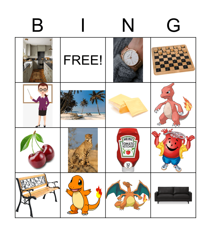 This bingo card has 15 images and 1 words: FREE!.