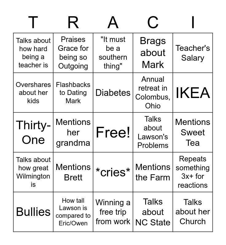 This bingo card has a free space and 24 words: Mentions Brett, How tall Lawson is compared to Eric/Owen, Diabetes, Bullies, Teacher's Salary, Talks about how hard being a teacher is, Overshares about her kids, Praises Grace for being so Outgoing, Talks about Lawson's Problems, *cries*, Annual retreat in Colombus, Ohio, Thirty-One, Mentions the Farm, Repeats something 3x+ for reactions, Flashbacks to Dating Mark, Talks about NC State, Mentions Sweet Tea, "It must be a southern thing", IKEA, Mentions her grandma, Talks about her Church, Talks about how great Wilmington is, Brags about Mark and Winning a free trip from work.