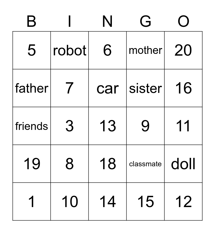 This bingo card has a free space and 29 words: 1, 2, 3, 4, 5, 6, 7, 8, 9, 10, 11, 12, 14, 15, 16, 17, 18, 19, 20, friends, classmate, brother, sister, father, mother, robot, doll, car and bus.