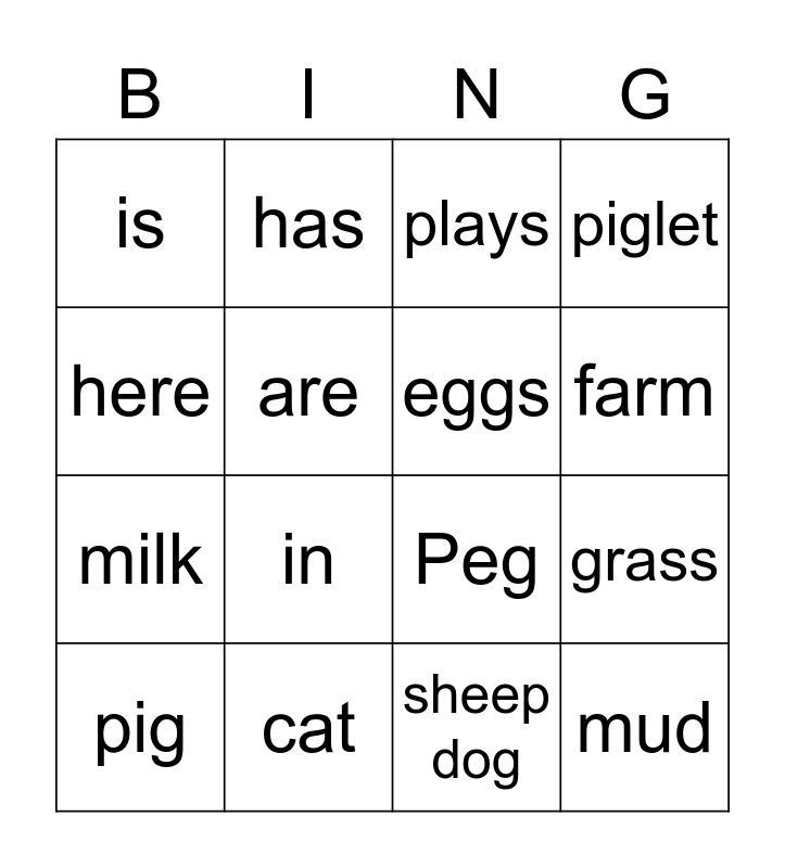 This bingo card has 24 words: Free!, fun, farm, Zeb, here, is, are, has, cat, hi, milk, Peg, hen, six, eggs, Rex, sheep dog, plays, in, grass, pig, mud, piglet and pen.