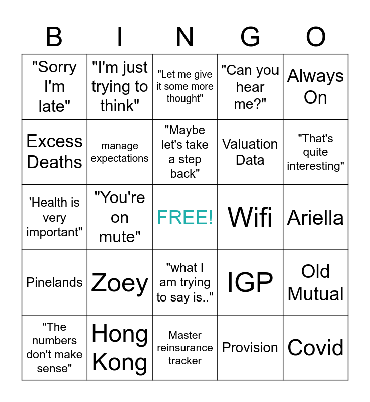 This bingo card has a free space and 24 words: Zoey, Hong Kong, "Maybe let's take a step back", "The numbers don't make sense", Always On, "Sorry I'm late", Excess Deaths, "I'm just trying to think", Wifi, "what I am trying to say is..", Valuation Data, 'Health is very important", IGP, Old Mutual, manage expectations, Provision, Ariella, "Let me give it some more thought", "That's quite interesting", "You're on mute", Covid, Pinelands, "Can you hear me?" and Master reinsurance tracker.