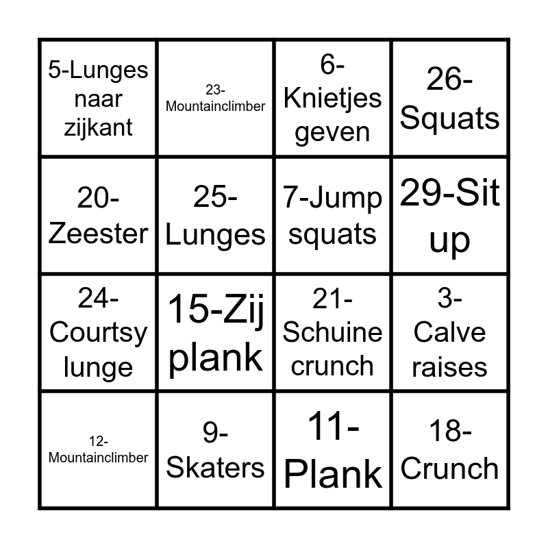 This bingo card has 30 words: 1-Lunges, 2-Squats, 3-Calve raises, 4-High knees, 5-Lunges naar zijkant, 6-Knietjes geven, 7-Jump squats, 8-Hakken naar billen, 9-Skaters, 10-Opdrukken, 11-Plank, 12-Mountainclimber, 13-Shoulder taps, 14-Commando's, 15-Zij plank, 16-Armen draaien, 17-Burpees, 18-Crunch, 19-Sit up, 20-Zeester, 21-Schuine crunch, 22-Jumping jacks, 23-Mountainclimber, 24-Courtsy lunge, 25-Lunges, 26-Squats, 27-Burpees, 28-High knees, 29-Sit up and 30-Lunge(blijven veren).