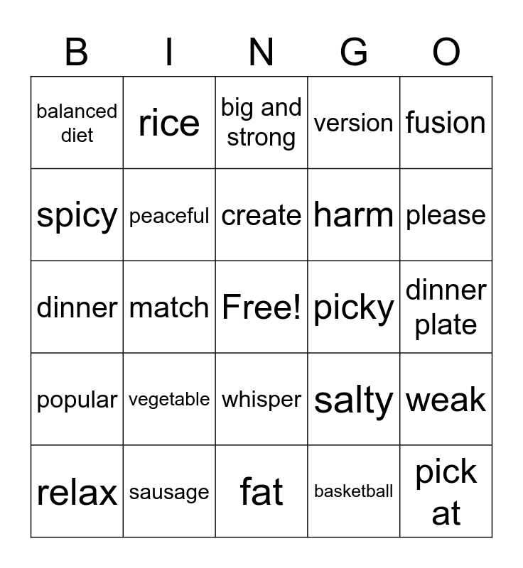 This bingo card has a free space and 39 words: royal, festival, instrument, peaceful, relax, whisper, create, meet, fusion, popular, match, version, pick at, dinner plate, picky, vegetable, plenty of, balanced diet, grain, salty, spicy, fat, harm, please, be good at, sugar, parents, kids, healthy, rice, corn, happy, big and strong, sausage, basketball, strong, weak, dinner and breakfast.