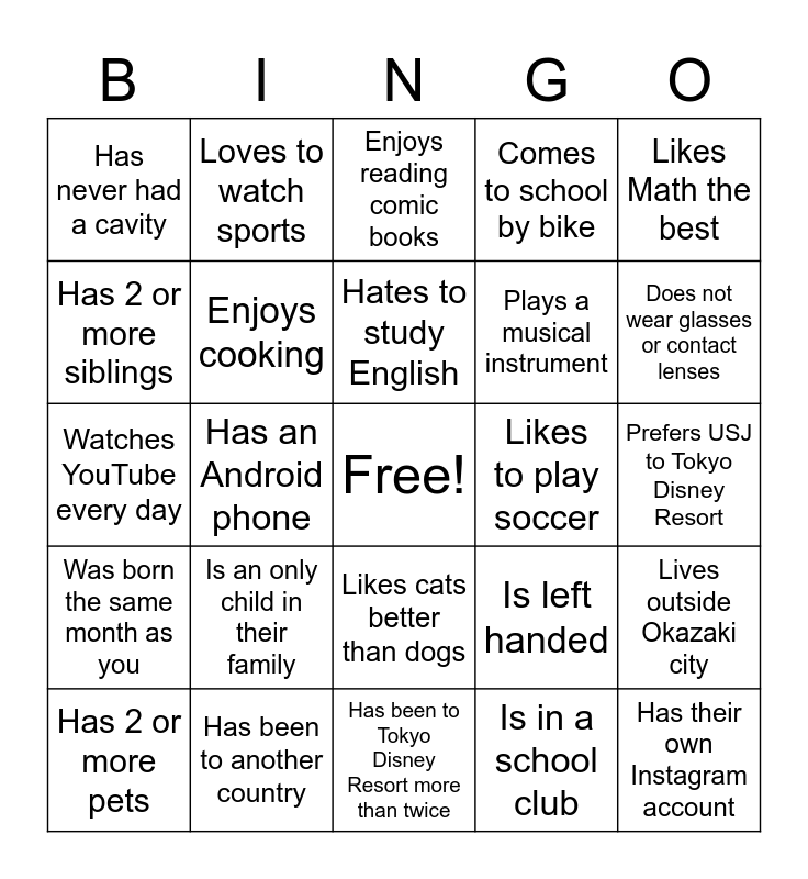 This bingo card has a free space and 24 words: Is an only child in their family, Has been to another country, Hates to study English, Has 2 or more pets, Likes Math the best, Has never had a cavity, Has 2 or more siblings, Loves to watch sports, Likes to play soccer, Likes cats better than dogs, Plays a musical instrument, Watches YouTube every day, Is left handed, Lives outside Okazaki city, Enjoys cooking, Is in a school club, Prefers USJ to Tokyo Disney Resort, Enjoys reading comic books, Does not wear glasses or contact lenses, Has an Android phone, Has their own Instagram account, Was born the same month as you, Comes to school by bike and Has been to Tokyo Disney Resort more than twice.