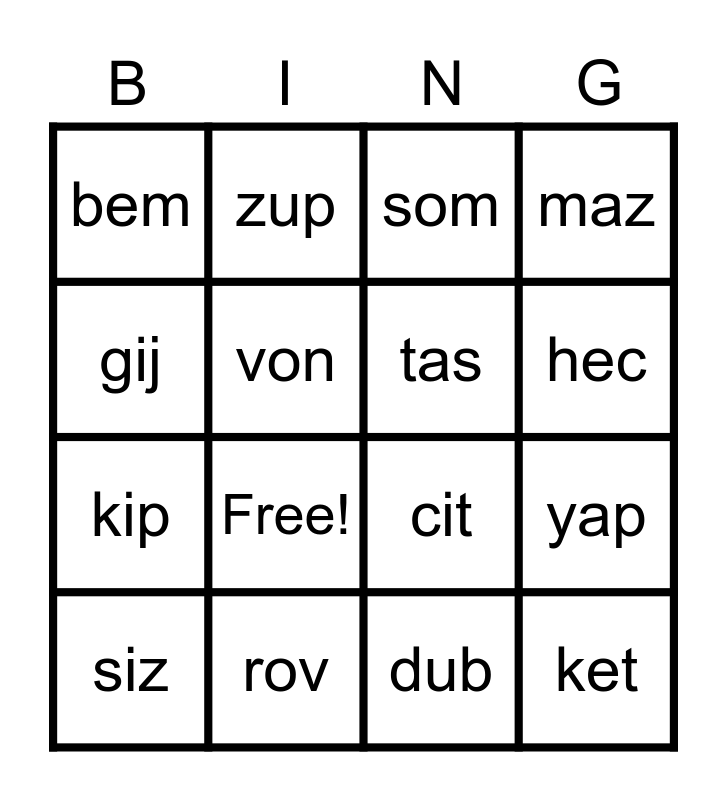 This bingo card has 18 words: Free!, ket, som, bem, cit, maz, siz, zup, hec, kip, dub, gij, yap, von, tas, pif, rov and tuz.