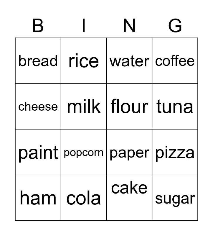 This bingo card has 16 words: cola, pizza, water, bread, paint, rice, paper, cake, cheese, milk, ham, coffee, popcorn, tuna, flour and sugar.