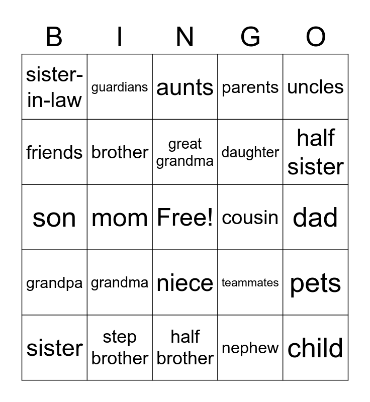 This bingo card has a free space and 29 words: sister, twins, mom, roommates, sister-in-law, aunts, brother, grandma, cousin, step brother, dad, child, half brother, nephew, half sister, classmates, niece, grandpa, uncles, son, teammates, step sister, daughter, friends, parents, guardians, pets, great grandma and great grandpa.