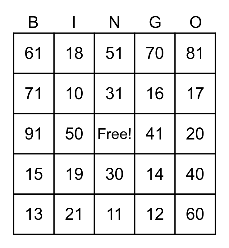 This bingo card has a free space and 24 words: 19, 21, 31, 13, 81, 61, 71, 18, 41, 30, 16, 91, 14, 40, 10, 12, 20, 51, 17, 50, 60, 15, 70 and 11.