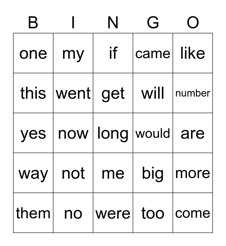 This bingo card has 25 words: not, were, get, them, like, one, this, my, would, me, will, yes, big, more, went, come, are, if, number, now, long, no, way, came and too.