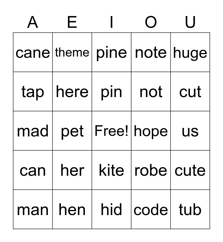 This bingo card has a free space and 60 words: hat, her, rid, hop, us, hate, here, ride, hope, use, tap, them, not, cub, tape, theme, pin, note, cube, mad, pet, pine, rod, cut, plane, Steve, kite, cope, huge, plan, bed, kit, cop, hug, cane, scene, hide, robe, dude, can, these, hid, code, tube, mane, red, fine, cod, dud, man, hen, fin, rob, tub, made, Pete, bite, rode, cute and bit.