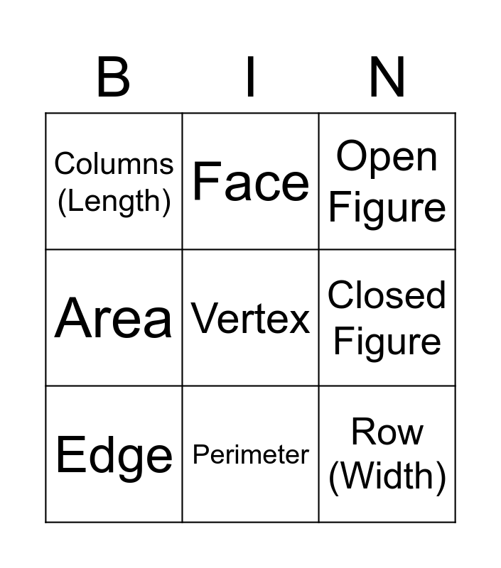 This bingo card has a free space and 8 words: Closed Figure, Open Figure, Face, Edge, Columns (Length), Row (Width), Area and Perimeter.