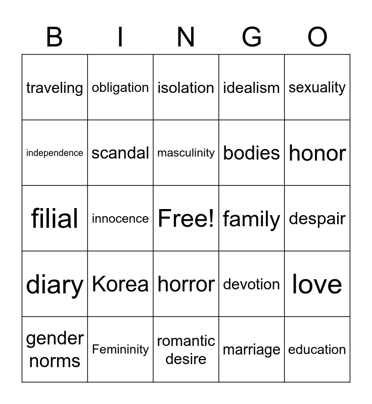 This bingo card has a free space and 24 words: Korea, Femininity, masculinity, gender norms, sexuality, traveling, independence, obligation, family, horror, bodies, filial, devotion, love, scandal, marriage, despair, isolation, honor, innocence, education, diary, idealism and romantic desire.