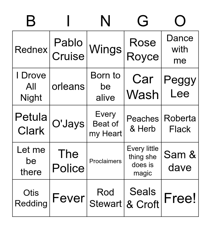 This bingo card has 33 words: Free!, Fly Like an Eagle, O'Jays, Love train, Let me be there, orleans, Dance with me, Otis Redding, Pablo Cruise, Love will find a way, Born to be alive, Wings, Band on the Run, Mother & Child Reunion, Peaches & Herb, Peggy Lee, Fever, Petula Clark, The Police, Every little thing she does is magic, Proclaimers, Somebody to love, Rednex, Roberta Flack, Rod Stewart, Every Beat of my Heart, Rose Royce, Car Wash, I Drove All Night, Sam & dave, Angel, Seals & Croft and All I Wanna Do.