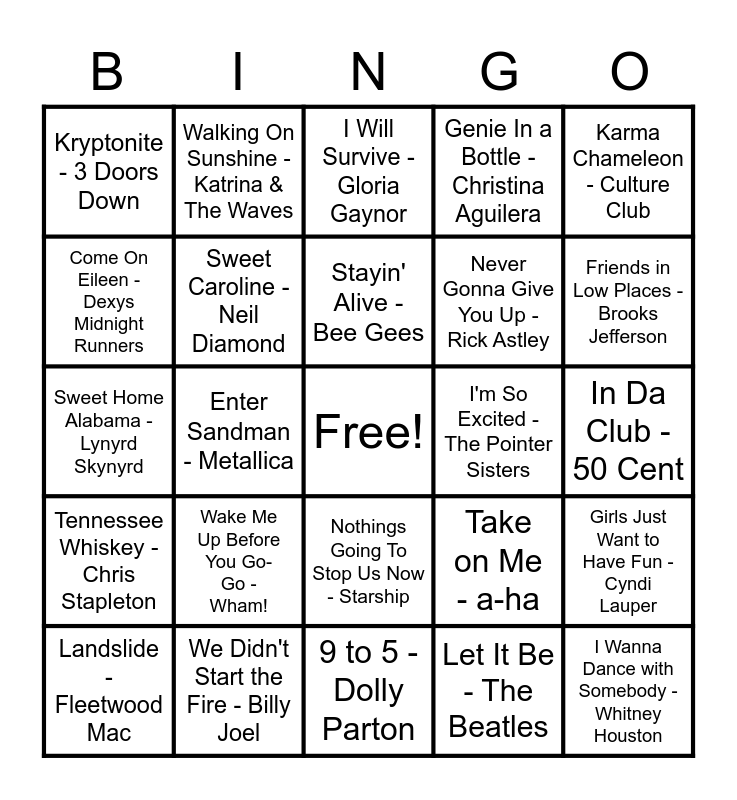 This bingo card has a free space and 48 words: Livin' La Vida Loca - Ricky Martin, I Wanna Dance with Somebody -Whitney Houston, I Want it That Way - Backstreet Boys, 9 to 5 - Dolly Parton, Wake Me Up Before You Go-Go - Wham!, Africa - TOTO, Walking On Sunshine - Katrina & The Waves, All Star - Smash Mouth, Come On Eileen - Dexys Midnight Runners, ...Baby One More Time - Britney Spears, Sweet Caroline - Neil Diamond, Genie In a Bottle - Christina Aguilera, Girls Just Want to Have Fun - Cyndi Lauper, Take on Me - a-ha, Hey Ya! - Outkast, MMMBop - Hanson, Stayin' Alive - Bee Gees, I'm So Excited - The Pointer Sisters, You Make My Dreams (Come True) - Hall & Oates, Karma Chameleon - Culture Club, Enter Sandman - Metallica, Let It Be - The Beatles, Kryptonite - 3 Doors Down, Never Gonna Give You Up - Rick Astley, Despactio - Luis Fonsi (Justin Bieber), Friends in Low Places - Brooks Jefferson, Landslide - Fleetwood Mac, Johnny B. Goode - Chuck Berry, Nothings Going To Stop Us Now - Starship, Tennessee Whiskey - Chris Stapleton, Teenage Dream - Katy Perry, Wait for It - Leslie Odom Jr. (Hamilton), Night Moves - Bob Seger, Take Me Home, Country Roads - John Denver, We Didn't Start the Fire - Billy Joel, September - Earth, Wind & Fire, Beyond - Leon Bridges, In Da Club - 50 Cent, Dancing Queen - ABBA, Call Me Maybe - Carly Rae Jepsen, Truth Hurts - Lizzo, Super Bass - Nicki Minaj, I Will Survive - Gloria Gaynor, American Pie - Don McLean, Sweet Home Alabama - Lynyrd Skynyrd, Livin' On A Prayer - Bon Jovi, Mambo No. 5 - Lou Bega and Kyrie - Mr. Mister.