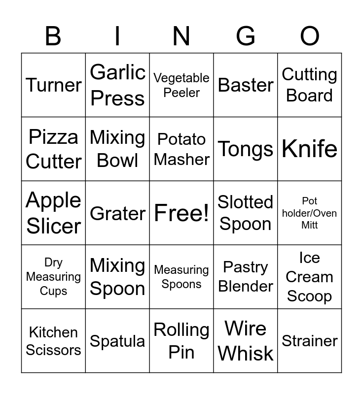 This bingo card has a free space and 29 words: Kitchen Scissors, Colander, Grater, Liquid Measuring Cup, Turner, Vegetable Peeler, Mixing Bowl, Mixing Spoon, Slotted Spoon, Spatula, Pot holder/Oven Mitt, Strainer, Rolling Pin, Wire Whisk, Knife, Ladle, Measuring Spoons, Dry Measuring Cups, Cutting Board, Apple Slicer, Pastry Blender, Can Opener, Tongs, Pizza Cutter, Baster, Garlic Press, Ice Cream Scoop, Potato Masher and Thermometer.
