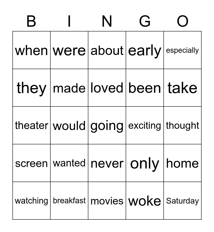 This bingo card has 25 words: wanted, movies, loved, watching, especially, when, they, were, exciting, never, been, theater, only, home, made, Saturday, thought, about, take, would, going, breakfast, screen, early and woke.