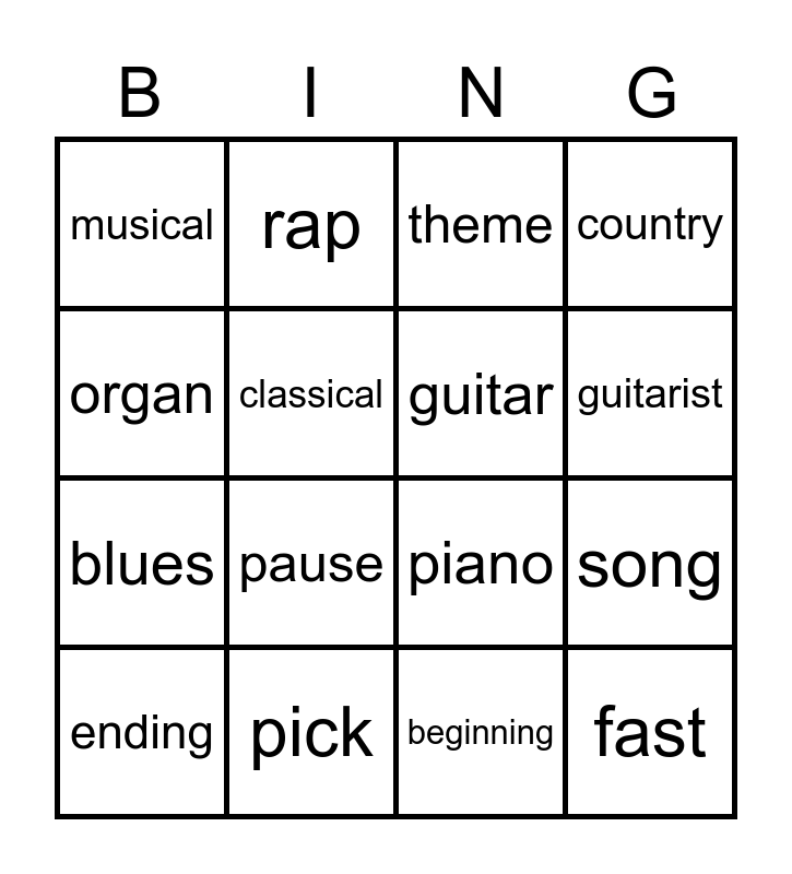 This bingo card has 30 words: Free!, note, song, opera, musical, theme, guitar, strum, pick, ukulele, beginning, ending, volume, melody, pause, loud, soft, fast, slow, organ, piano, overture, rap, blues, classical, country, folk, singer, guitarist and flute.