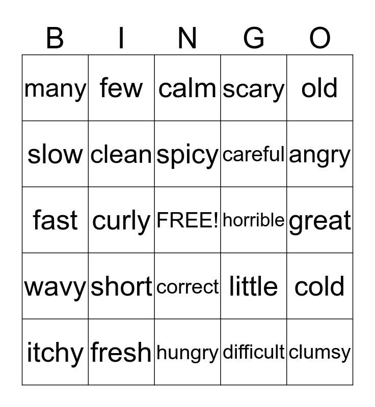 This bingo card has a free space and 24 words: short, fresh, spicy, itchy, old, many, slow, few, horrible, correct, careful, fast, little, cold, clean, difficult, great, calm, angry, curly, clumsy, wavy, scary and hungry.