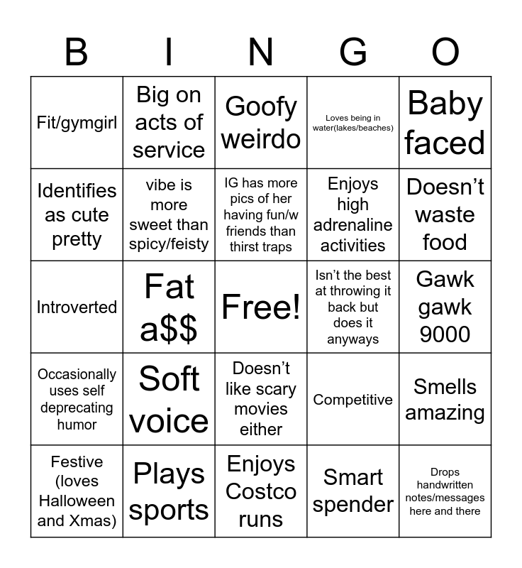 This bingo card has a free space and 24 words: Soft voice, Plays sports, IG has more pics of her having fun/w friends than thirst traps, Festive (loves Halloween and Xmas), Baby faced, Fit/gymgirl, Identifies as cute pretty, Big on acts of service, Isn’t the best at throwing it back but does it anyways, Doesn’t like scary movies either, Enjoys high adrenaline activities, Introverted, Competitive, Smells amazing, vibe is more sweet than spicy/feisty, Smart spender, Gawk gawk 9000, Goofy weirdo, Doesn’t waste food, Fat a$$, Drops handwritten notes/messages here and there, Occasionally uses self deprecating humor, Loves being in water(lakes/beaches) and Enjoys Costco runs.