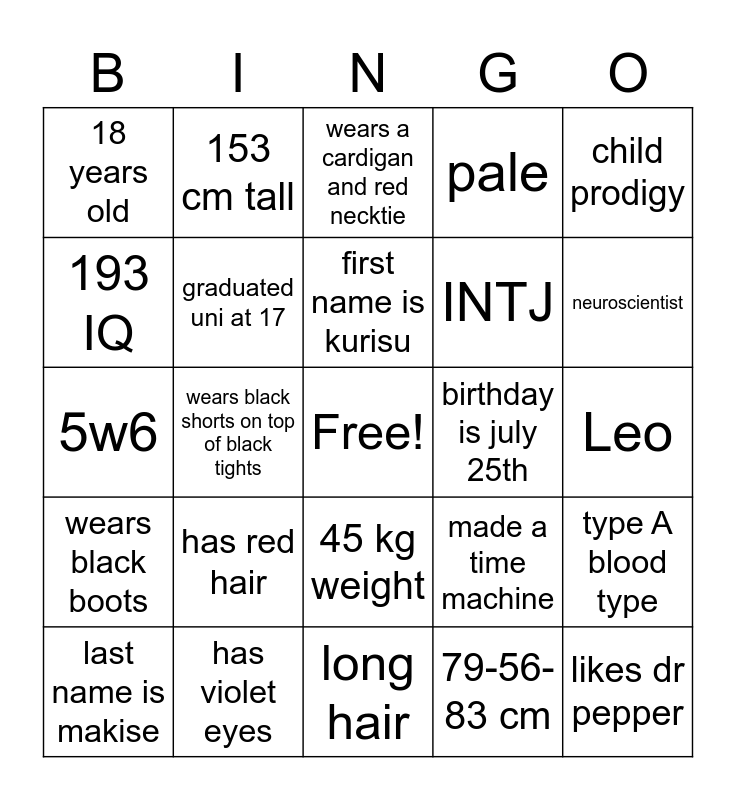 This bingo card has a free space and 24 words: has red hair, has violet eyes, first name is kurisu, last name is makise, child prodigy, 18 years old, 193 IQ, 153 cm tall, birthday is july 25th, 45 kg weight, INTJ, 5w6, made a time machine, type A blood type, graduated uni at 17, 79-56-83 cm, Leo, wears a cardigan and red necktie, neuroscientist, wears black shorts on top of black tights, likes dr pepper, wears black boots, pale and long hair.