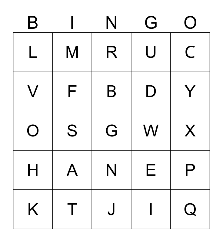 This bingo card has 25 words: A, J, B, K, C, L, V, M, W, N, D, O, E, P, F, Q, X, R, Y, S, G, T, H, U and I.