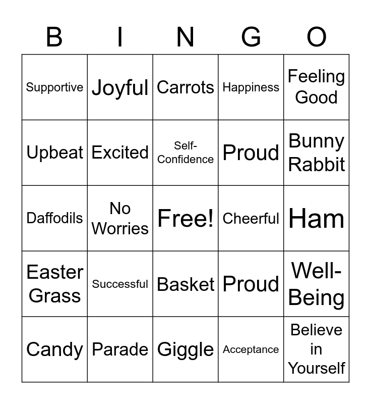 This bingo card has a free space and 48 words: Inner=Strength, Believe in Yourself, Friendly, Giggle, Successful, Courage, Joyful, Laugh Often, Upbeat, Kindness, Excited, Happiness, Well-Being, Proud, Dream Big, Inspiration, Self-Confidence, Cheerful, Hopeful, Feeling Good, No Worries, Acceptance, Supportive, Proud, Easter, Bunny Rabbit, Candy, Cadbury Creme Eggs, Basket, Easter Grass, Jelly Beans, Peeps, Bonnett, Spring, Parade, Lillies, Lent, Ham, HOP Movie, Chicks, Reese Eggs, Egg Dye, Carrots, Egg Hunt, Daffodils, Good Friday, Pastel Colors and Resurrection.