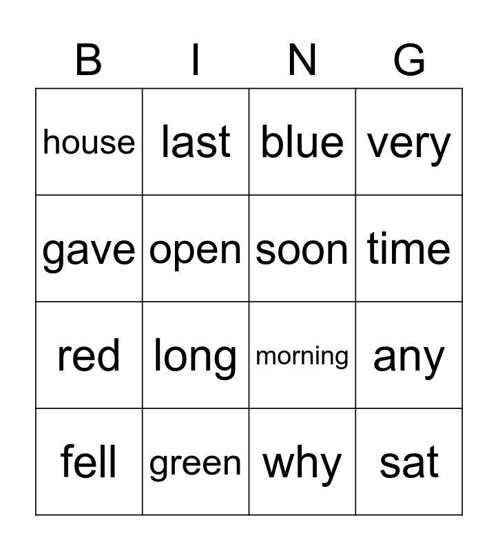 This bingo card has 20 words: any, because, blue, every, fell, gave, green, house, red, last, long, morning, open, sat, soon, than, time, very, why and year.