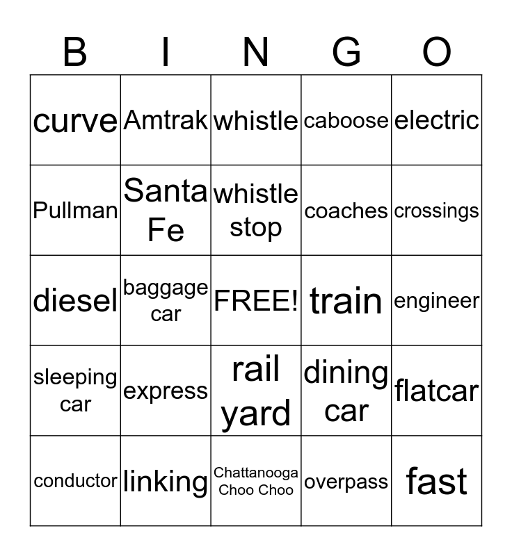 This bingo card has a free space and 72 words: all aboard, Amtrak, baggage car, box car, brakeman, cab, caboose, chug, coaches, commute, conductor, coupler, crossings, curve, derail, diesel, dining car, electric, engine, engineer, express, fast, flatcar, freight, high speed, hopper car, hydraulics, joint bar, journey, junction, linking, locomotive, metro liner, monorail, overpass, passenger, private car, puff, Pullman, rail car, rail yard, railroad, rails, seats, signal, sleeping car, station, steam power, switch, tanker, terminal, ticket, tracks, train, transcontinental, transportation, whistle, whistle stop, B&O Railroad, Reading Railroad, Pennsylvania Railroad, Short Line, Wabash Cannonball, Chattanooga Choo Choo, Atchison, Topeka, Santa Fe, Casey Jones, wheels, cargo, nonstop and sight see.