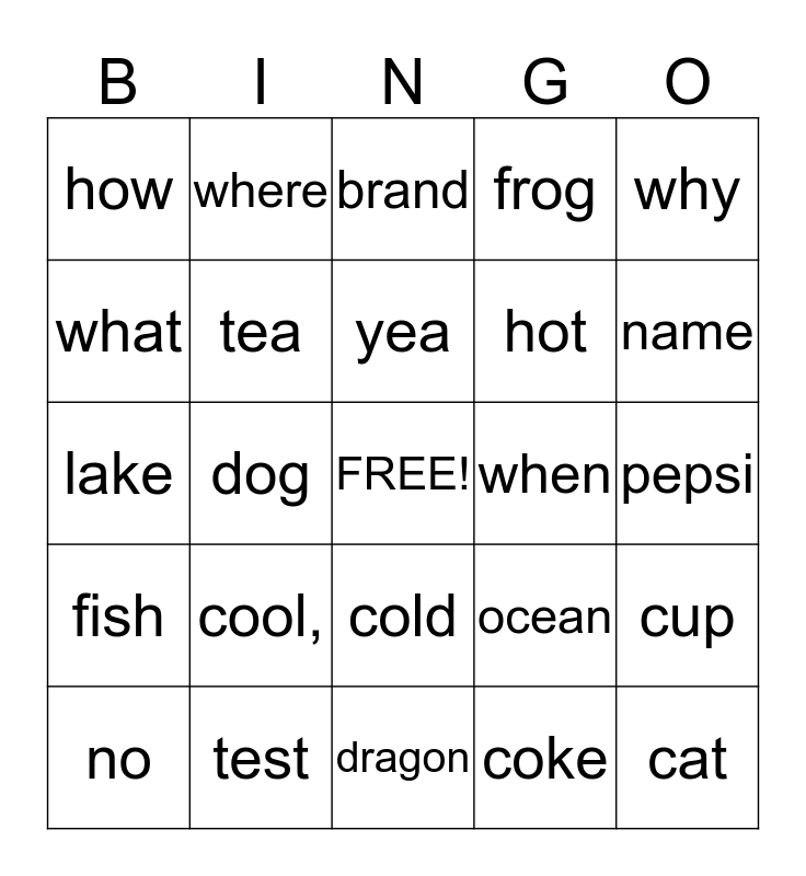 This bingo card has a free space and 24 words: cool,, test, yea, no, why, how, what, where, when, cold, hot, lake, ocean, cup, tea, coke, pepsi, brand, name, dog, cat, fish, frog and dragon.
