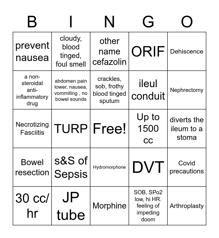 This bingo card has a free space and 29 words: 30 cc/ hr, cold, clammy skin; a weak, thready and rapid pulse, TURP, Evisceration, prevent nausea, other name cefazolin, abdomen pain lower, nausea, vommiting , no bowel sounds, s&S of Sepsis, Up to 1500 cc, JP tube, diverts the ileum to a stoma, Arthroplasty, Morphine, SOB, SPo2 low, hi HR. feeling of impeding doom, Nephrectomy, Pain, Paralysis, Pallor, Parasthesia and Pulses, Hydromorphone, Bowel resection, Dehiscence, Necrotizing Fasciitis, DVT, Ileus, ileul conduit, a non-steroidal anti-inflammatory drug, ORIF, cloudy, blood tinged, foul smell, Covid precautions, crackles, sob, frothy blood tinged sputum and shortened, external rotation, pain.