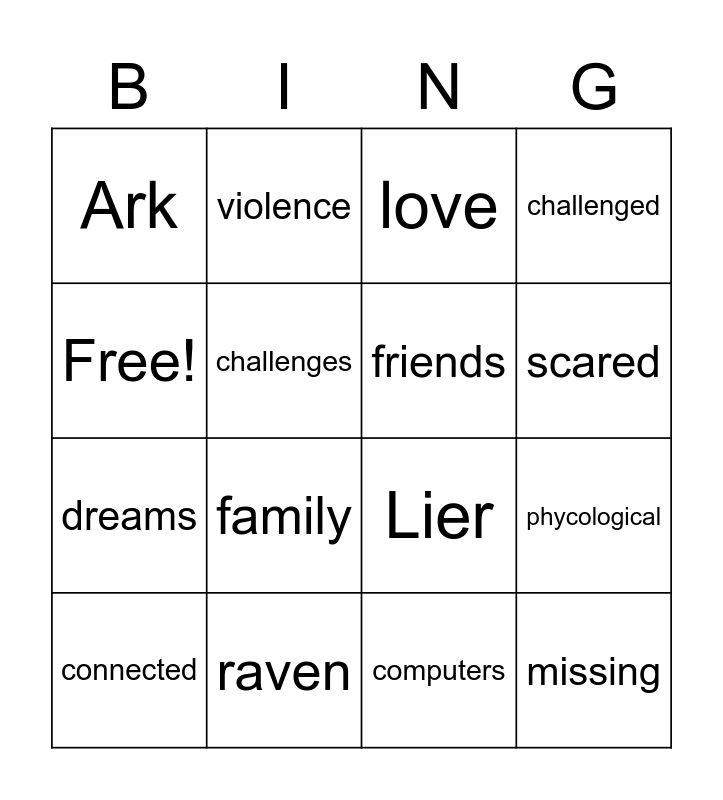 This bingo card has 16 words: raven, phycological, love, Ark, dreams, violence, Lier, computers, Free!, challenges, connected, challenged, family, scared, friends and missing.