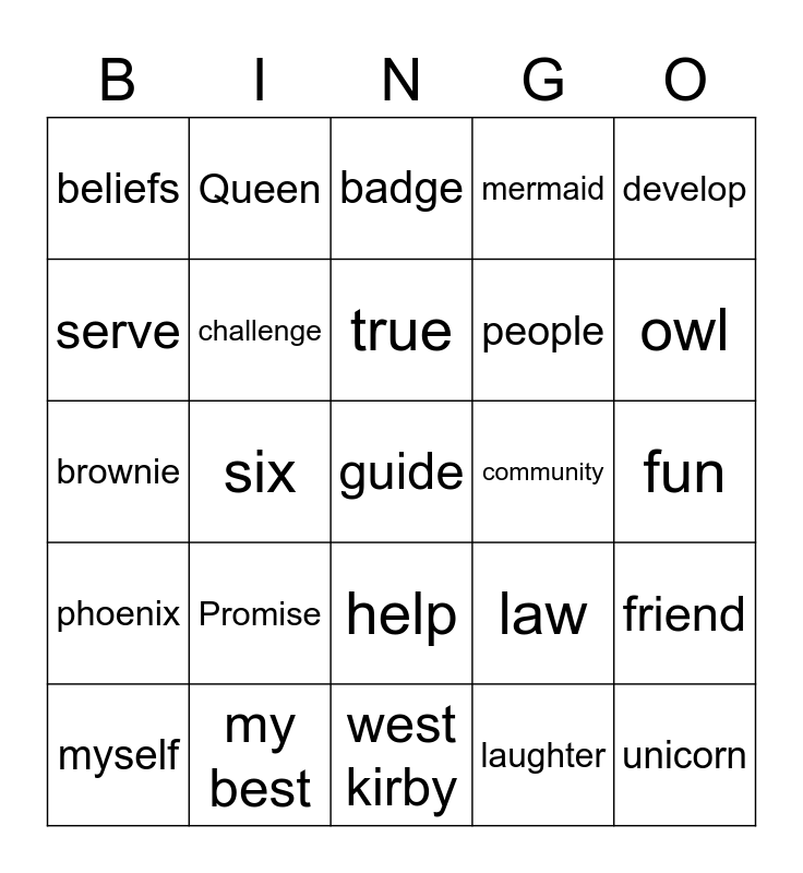 This bingo card has a free space and 24 words: Promise, my best, true, myself, develop, beliefs, serve, Queen, community, help, people, brownie, law, friend, challenge, laughter, fun, badge, owl, six, unicorn, phoenix, mermaid and west kirby.