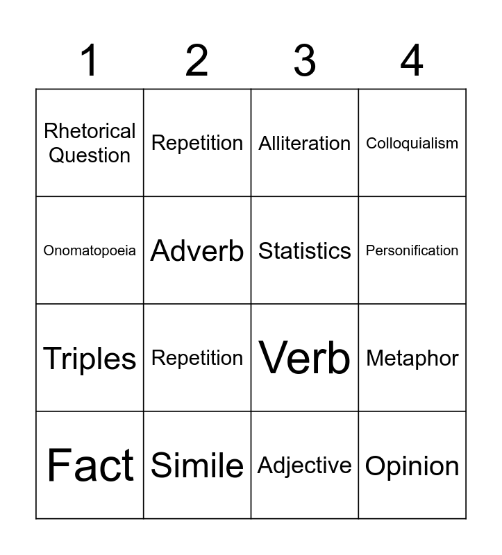 This bingo card has 16 words: Simile, Metaphor, Alliteration, Rhetorical Question, Triples, Repetition, Verb, Adjective, Onomatopoeia, Adverb, Fact, Colloquialism, Repetition, Personification, Statistics and Opinion.
