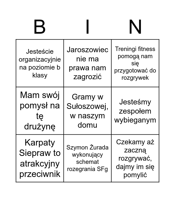 This bingo card has a free space and 8 words: Jesteśmy zespołem wybieganym, Treningi fitness pomogą nam się przygotować do rozgrywek, Jaroszowiec nie ma prawa nam zagrozić, Karpaty Siepraw to atrakcyjny przeciwnik, Jesteście organizacyjnie na poziomie b klasy, Czekamy aż zaczną rozgrywać, dajmy im się pomylić, Mam swój pomysł na tę drużynę and Szymon Żurada wykonujący schemat rozegrania SFg.