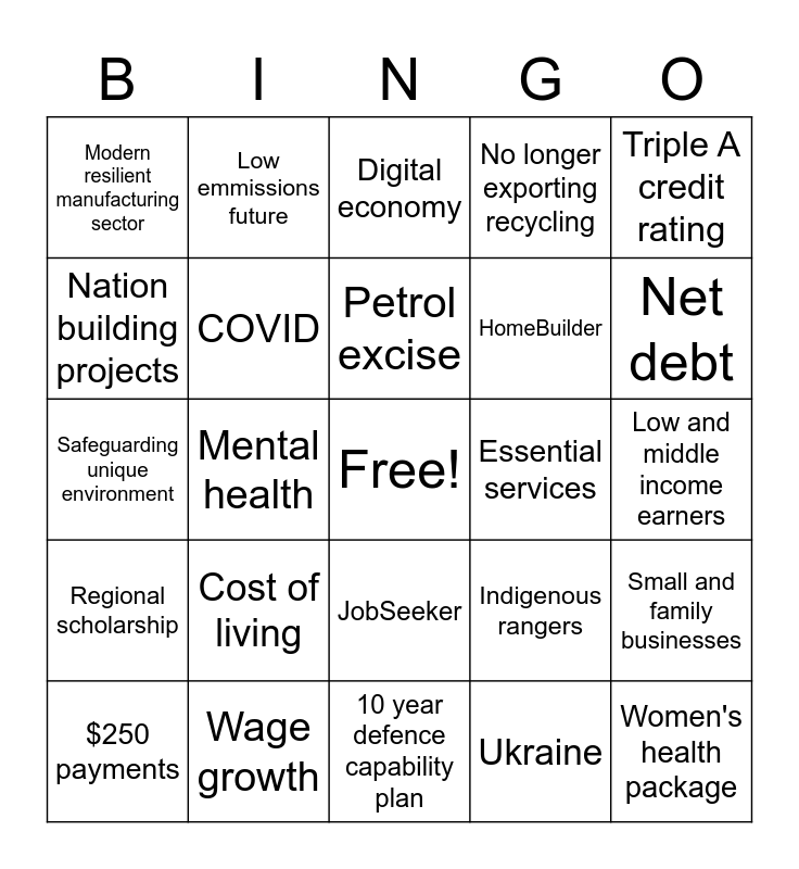This bingo card has a free space and 24 words: Cost of living, Wage growth, Petrol excise, $250 payments, Triple A credit rating, Modern resilient manufacturing sector, Nation building projects, Low emmissions future, Essential services, JobSeeker, HomeBuilder, Safeguarding unique environment, Indigenous rangers, Small and family businesses, COVID, Ukraine, Low and middle income earners, Digital economy, Net debt, Mental health, Women's health package, Regional scholarship, No longer exporting recycling and 10 year defence capability plan.