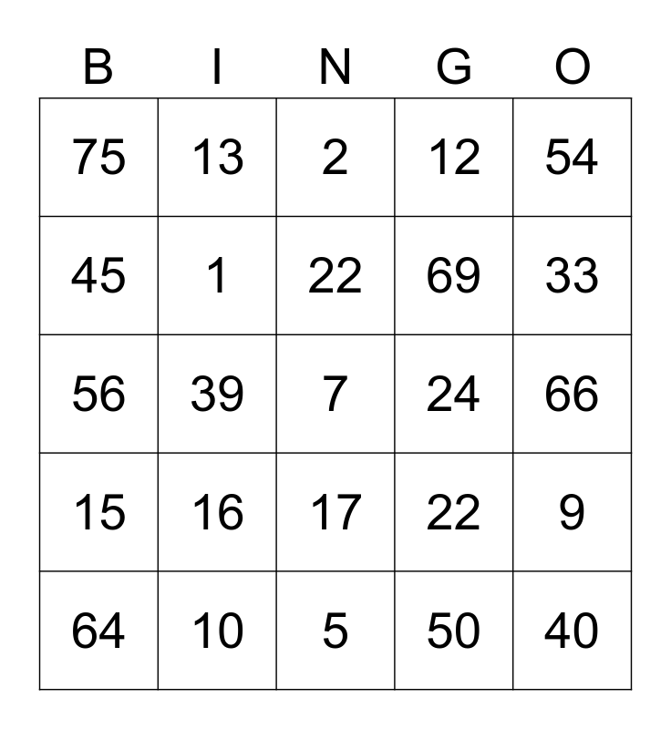 This bingo card has a free space and 24 words: 16, 10, 22, 64, 54, 75, 45, 13, 24, 17, 69, 56, 22, 9, 1, 50, 66, 2, 33, 39, 40, 15, 12 and 5.