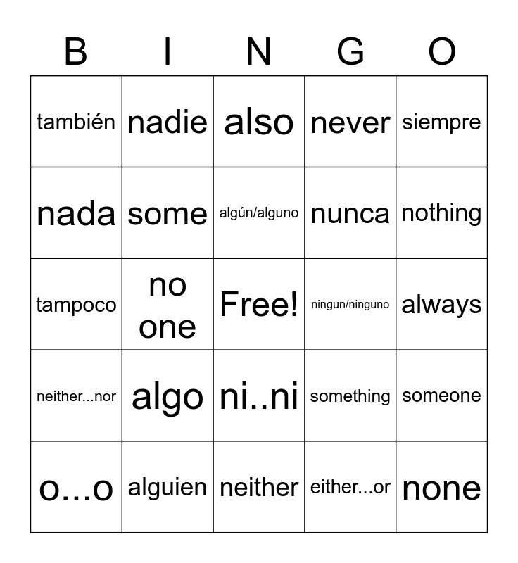 This bingo card has a free space and 24 words: algo, alguien, algún/alguno, o...o, siempre, también, nada, nadie, ningun/ninguno, ni..ni, nunca, tampoco, something, someone, some, either...or, always, also, nothing, no one, none, neither...nor, never and neither.