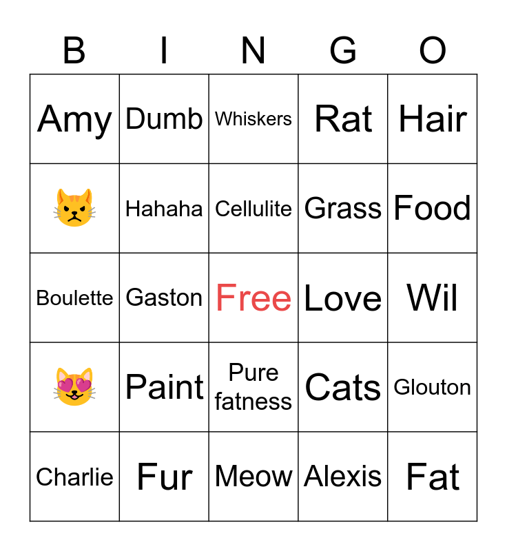 This bingo card has a free space and 29 words: Charlie, Hugs, Gaston, Opera, Amy, Whiskers, Hahaha, Paint, Love, Fur, Wil, Fat, Meow, Alexis, Food, Pink, Pure fatness, 😻, Hair, Boulette, Cats, Nose, Grass, 😾, Rat, Dumb, Glouton, Cellulite and Lump.