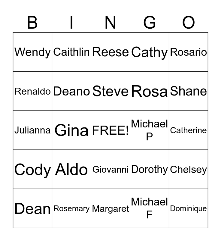 This bingo card has a free space and 24 words: Aldo, Rosemary, Steve, Dean, Rosario, Wendy, Renaldo, Caithlin, Michael P, Giovanni, Rosa, Julianna, Dorothy, Chelsey, Deano, Michael F, Catherine, Reese, Shane, Gina, Dominique, Cody, Cathy and Margaret.