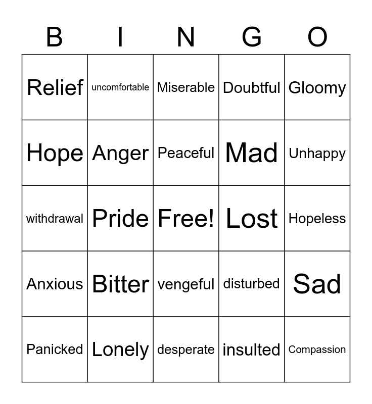 This bingo card has a free space and 38 words: Joy, Hate, Love, Anger, Sad, Bitter, Peaceful, Nervous, Gloomy, Mad, Pride, Doubtful, Compassion, Hopeless, Hope, Anxious, Worried, Miserable, Disappointed, Lost, Relief, Lonely, Unhappy, Panicked, horrified, desperate, confused, stressed, irritated, mad, cheated, vengeful, insulted, uncomfortable, nauseated, disturbed, withdrawal and aversion.