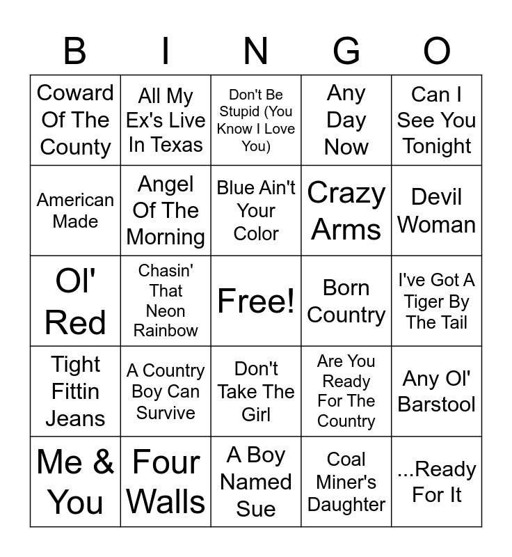 This bingo card has a free space and 50 words: (Maria) Shut Up & Kiss Me, ...Ready For It, A Better Man, A Boy Named Sue, A Country Boy Can Survive, A Hundred Years From Now, All My Ex's Live In Texas, All My Friend's Say, American Made, American Saturday Night, Angel Of The Morning, Any Day Now, Any Ol' Barstool, Are You Ready For The Country, Austin, Bless The Broken Road, Blue Ain't Your Color, Born Country, Brand New Man, Can I See You Tonight, Chasin' That Neon Rainbow, Coal Miner's Daughter, Coward Of The County, Crazy Arms, D.I.V.O.R.C.E., Daddy Frank (The Guitar Man), Devil Woman, Diggin' Up Bones, Don't Be Stupid (You Know I Love You), Don't Take The Girl, Dreams Of The Everyday Housewife, Drivin' My Life Away, Elizabeth, Fancy, Four Walls, Friends In Low Places, Grandpa (Tell Me 'bout The Good Ol' Days, Help Me Make It Through The Night, I Love This Bar, I've Got A Tiger By The Tail, It's Just A Matter Of Time, Jesus, Take The Wheel, Jolene, Kiss An Angel Good Morning, Me & You, Ol' Red, Snowbird, The Long Black Viel, Tight Fittin Jeans and Turn Me Loose.
