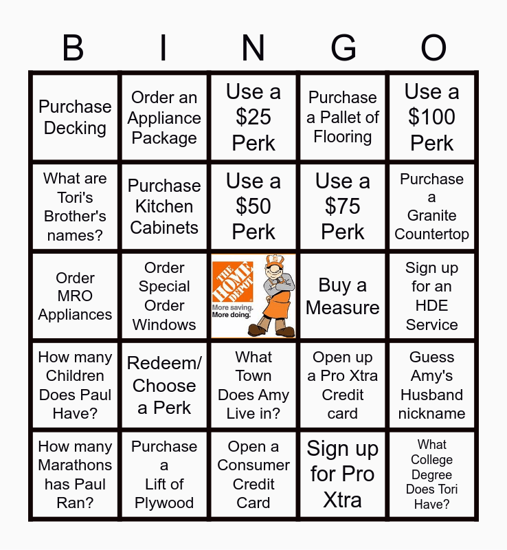 This bingo card has a free space and 24 words: Redeem/ Choose a Perk, Purchase a Lift of Plywood, Use a $50 Perk, How many Marathons has Paul Ran?, Use a $100 Perk, Purchase Decking, What are Tori's Brother's names?, Order an Appliance Package, Buy a Measure, What Town Does Amy Live in?, Use a $75 Perk, Order MRO Appliances, Open up a Pro Xtra Credit card, Guess Amy's Husband nickname, Purchase Kitchen Cabinets, Sign up for Pro Xtra, Sign up for an HDE Service, Use a $25 Perk, Purchase a Granite Countertop, Order Special Order Windows, What College Degree Does Tori Have?, How many Children Does Paul Have?, Purchase a Pallet of Flooring and Open a Consumer Credit Card.
