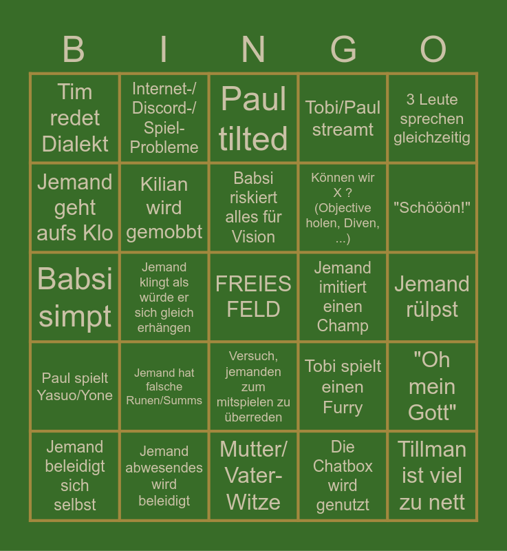 This bingo card has a free space and 44 words: Kilian "lernt", Tillman ist viel zu nett, Gespräch über ProPlay, Jemand beleidigt sich selbst, Tobi vermisst Tanks, Die Chatbox wird genutzt, Paul tilted, Soundkulisse (Zelt, Hund, Flughafen, Essen, ...), 3 Leute sprechen gleichzeitig, Jemand abwesendes wird beleidigt, Tobi/Paul streamt, Jemand imitiert einen Champ, Versuch, jemanden zum mitspielen zu überreden, Jemand hat falsche Runen/Summs, Musikbot joined, Mutter/ Vater- Witze, Jemand geht Essen/Trinken (holen), Babsi simpt, Jemand hat einen Sprachfehler, "Schööön!", Internet-/ Discord-/ Spiel- Probleme, Jemand beschwert sich über Champ X, Lebhafter Austausch von Beleidigungen (Min 3 hintereinander), Tim redet Dialekt, Tim redet übers feiern/über Alkohol, Jemand rülpst, Jemand fragt nach Spielmechanik, Wilde Dinge passieren im Rift, Tobi spielt einen Furry, Paul spielt Yasuo/Yone, Flirt-Stimmung, "Oh mein Gott", Zenner und Paul beleidigen sich, Babsi lässt das Egirl raushängen (zB "Eep!"), Jemand klingt als würde er sich gleich erhängen, Gespräch über Anime/Filme/ Serien o ä., Ein Mitspieler außerhalb des DC wird gelobt/geflamed, Jemand übersteuert, Babsi riskiert alles für Vision, Jemand geht aufs Klo, Können wir X ? (Objective holen, Diven, ...), Jemand hat ein S (+/-), Kilian wird gemobbt and Jemand singt/summt/ musiziert.