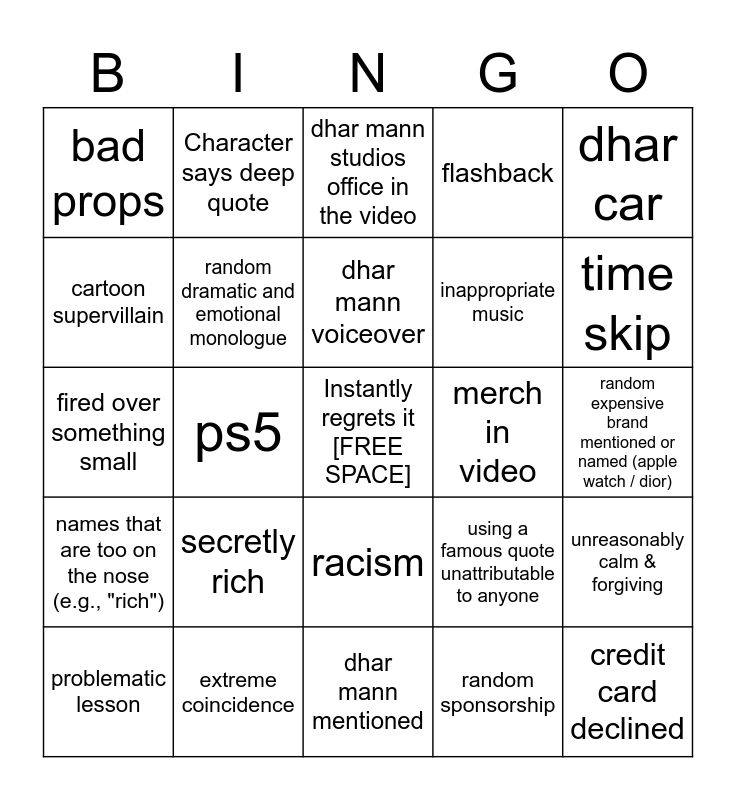 This bingo card has a free space and 36 words: "how would you feel if that happened to you?", child with unrealistic emotional maturity, clearly in the wrong person has an attitude, random dramatic and emotional monologue, using a famous quote unattributable to anyone, names that are too on the nose (e.g., "rich"), dhar mann voiceover, parking lot confrontation, dhar car, "you see" / "so you see", ps5, flashback, husband is fired, merch in video, time skip, bad props, bad green screen, secretly rich, credit card declined, dhar mann studios office in the video, random expensive brand mentioned or named (apple watch / dior), unreasonably calm & forgiving, extreme coincidence, problematic lesson, dhar mann mentioned, Character says deep quote, fired over something small, random celebrity appearance, inappropriate music, cartoon supervillain, someone gets evicted, kids with ipad, random sponsorship, racism, bad casting and random narration halfway through.